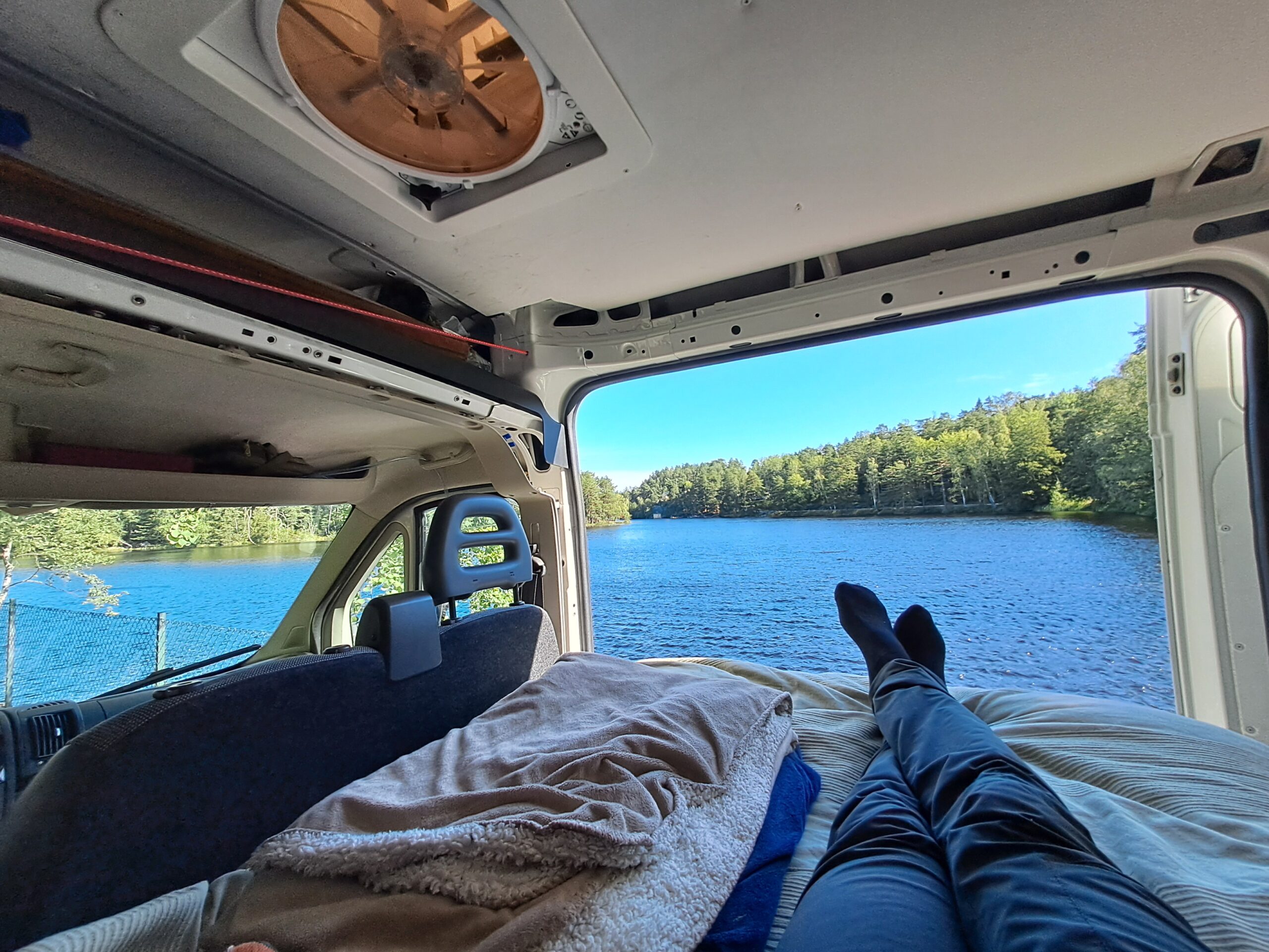 Vid Ågelsjön stod det rätt många campervans men parkeringen lutar rätt bra där så är man inte först på plats skulle jag inte rekommendera att stå där. Suuuuuperfint naturreservat. Klätterväggar, flera stycken, badstränder och en runda runt sjön man kunde gå eller springa. Vi klättrade båda dagarna, hängde vid väggarna och Viktor tränade en del på att trada. Jag nöjde mig med att bara klättra redan färdig led. Jag tyckte det var väldigt trevligt att klättra utomhus, även idag! Det blir mer varierat och jag kan på något sätt lättare tänka ut en väg jämfört med inomhus och bouldring (icke natursten liksom). Det är säkert bara jag som inte har tillräckligt med tålamod att tänka ut hur jag ska klättra, hehe. Jag fastnade verkligen för utomhus klättringen dessa två dagar. Vassa grepp dock så fingrar och skor blev slitna. Som jag har skrivit tidigare så är ju tyskarna duktig på att turista i Skandinavien, även här. Många tyskar, allt från promenerare till erfarna klättrare, hela familjer som lever campinglivet.